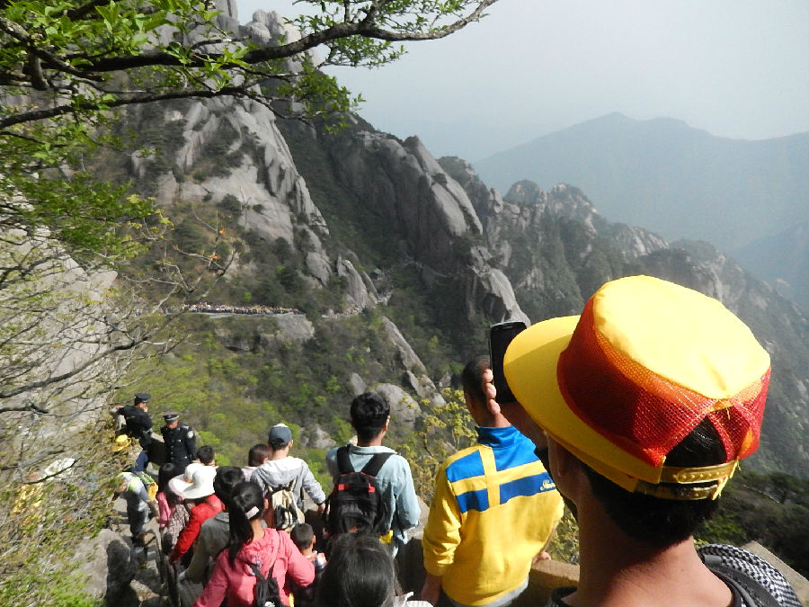 看過上圖,不知幾個人還能睡得好,雖然白天爬山太累??本人也本著之前去過一次黃山,認(rèn)為黃山的風(fēng)景還是很秀麗的,所以在今年5.1又帶家人去了一次,由于過節(jié)太擠了,索道太難等了,全家都是從云谷索道爬上去的,因為我去過一次,所以就由我?guī)ьI(lǐng)家人從以前走過的線路走的.本以為這次也帶家人看一看黃山在書中所寫的半山寺外抬頭見,展翅金雞叫道衢;登上龍蟠回首睹,扶肩五老上天都的風(fēng)景,可惜月份去得太早了點,樹也才發(fā)芽,葉子都還沒有長出來,最難受的那就是人太多,一路是走走停停,不遠(yuǎn)的路都要走比平時多幾倍的時間.